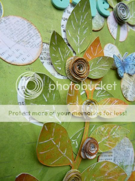 Ik heb de groene blaadjes & vlinders deels uit het dessin papier gesneden, deze ge-embossed zodat ze een beetje vanaf de pagina komen en je het dessin papier met kranten print wat er onder zit ziet.